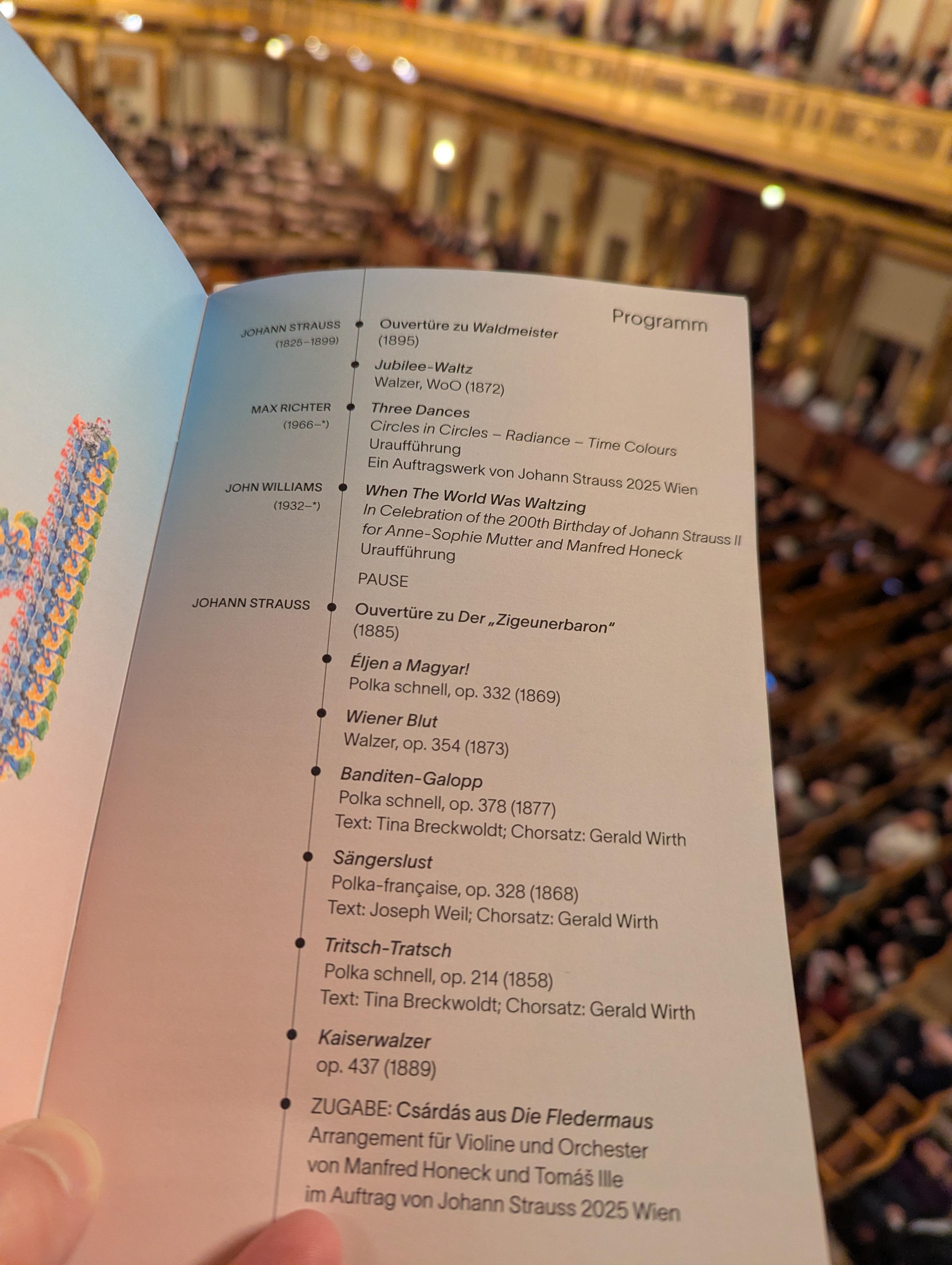The Williams didn’t seem to be anything too special (not that I really expected it to be), but still one of the meatier pieces of the concert (certainly compared to the Richter). Unlike the Richter, it was actually a waltz, for full orchestra and solo violin, with some virtuoso solo passages and a short cadenza, and no fake ending. Tonal, though from what I recall, it raised the key with each segment. It’s mostly comparable to Williams’s other “theme” arrangements for ASM, except that it seemed to lack a strong theme, which made it a bit unmemorable, I’m afraid. After another concert half full of Strauss pieces I don’t remember much of it.