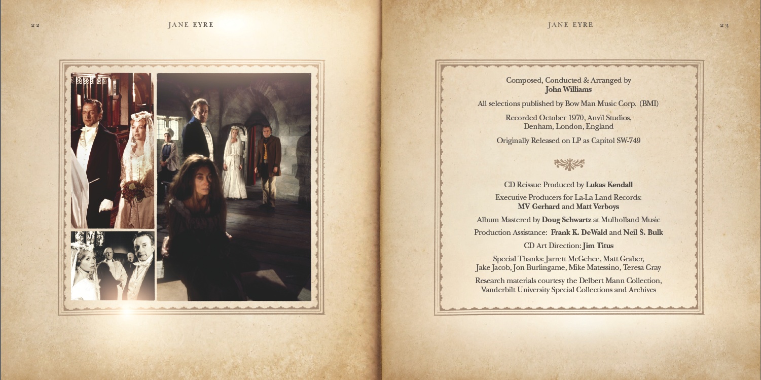 La La Land Records and Capitol Records are proud to reissue one of John Williams greatest scores, JANE EYRE, from the 1971 film starring George C Scott and Susannah York. For this CD reissue engineer Doug Schwartz worked from the ¼” 2 track stereo album masters from the Capitol EMI vault. The stunning 24 page booklet by Jim Titus features in depth liner notes by Williams historian Jeff Eldridge as well as reprints the notes from the original LP package. Sadly the complete recorded score has been lost to the ages and all that has survived is the LP masters. The tracks are identical to previous releases, but the sound has been greatly improved and Jim’s packaging is worth the price alone! While not the “definitive edition” we had hoped for, this release sure packs a wallop! If you never owned this score now is the time to pick it up!