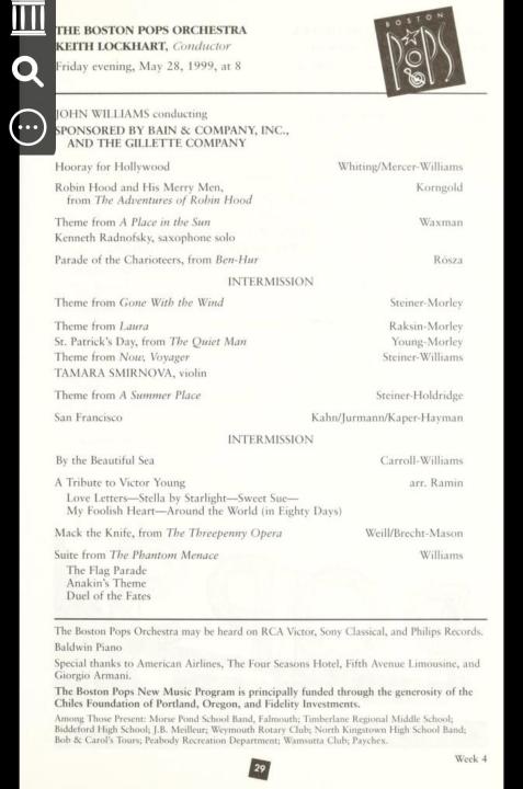 I would venture to guess it is Williams’ arrangement of By the Beautiful Sea listed in this program I pulled from the BSO Archives, the lyrics of which go “By the sea, by the sea, by the beautiful sea…” This piece was played at multiple performances that week, one of which I had actually attended back when I was in high school. I don’t remember much about the arrangement other than that it was in a similar vein as his Hooray for Hollywood arrangement and that (you guessed correctly!) it featured a brief quote of the Jaws bass line at the very end of the piece. Anyone curious about how the tune sounds (though not the same arrangement) can listen to The Ferris Wheel Sequence from Williams’ score to 1941.