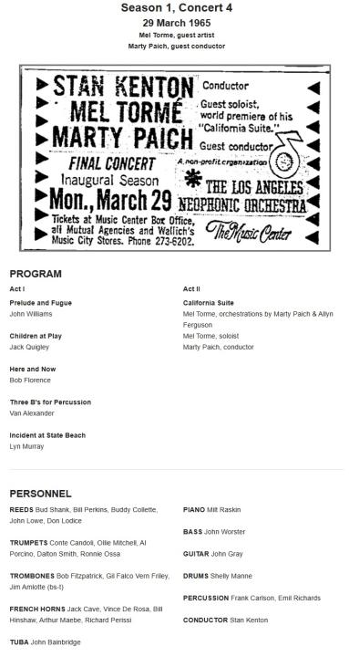 Imagine being in the audience of this concert with a list of unknown composers. For me, only three names I recognize, JW, Stan Kenton, and Emil Richards who I knew and conducted! He was everywhere! In nearly all Jerry Goldsmith percussion sections all the way through Giacchino's scores! As far as I can tell, this was a short lived pickup band with only 9 concerts.