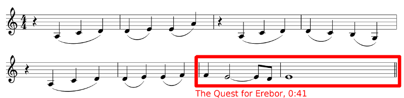 ChrisAfonso 159 Posted December 2, 2013 Share Posted December 2, 2013 Anyways, does anybody else think the melody from 0:41-0:48 of The Quest for Erebor sounds like Smaug's theme?Well I have to say that connection didn't cross my mind when I listened to it. So no. But sounds vaguely familiar. Obviously I need to listen to this score a few more times! It has a slight connection with Smaug's downward motif, yes. But it's also exactly the final quarter of the "Durin"(?) theme: Link to comment Share on other sites More sharing options...